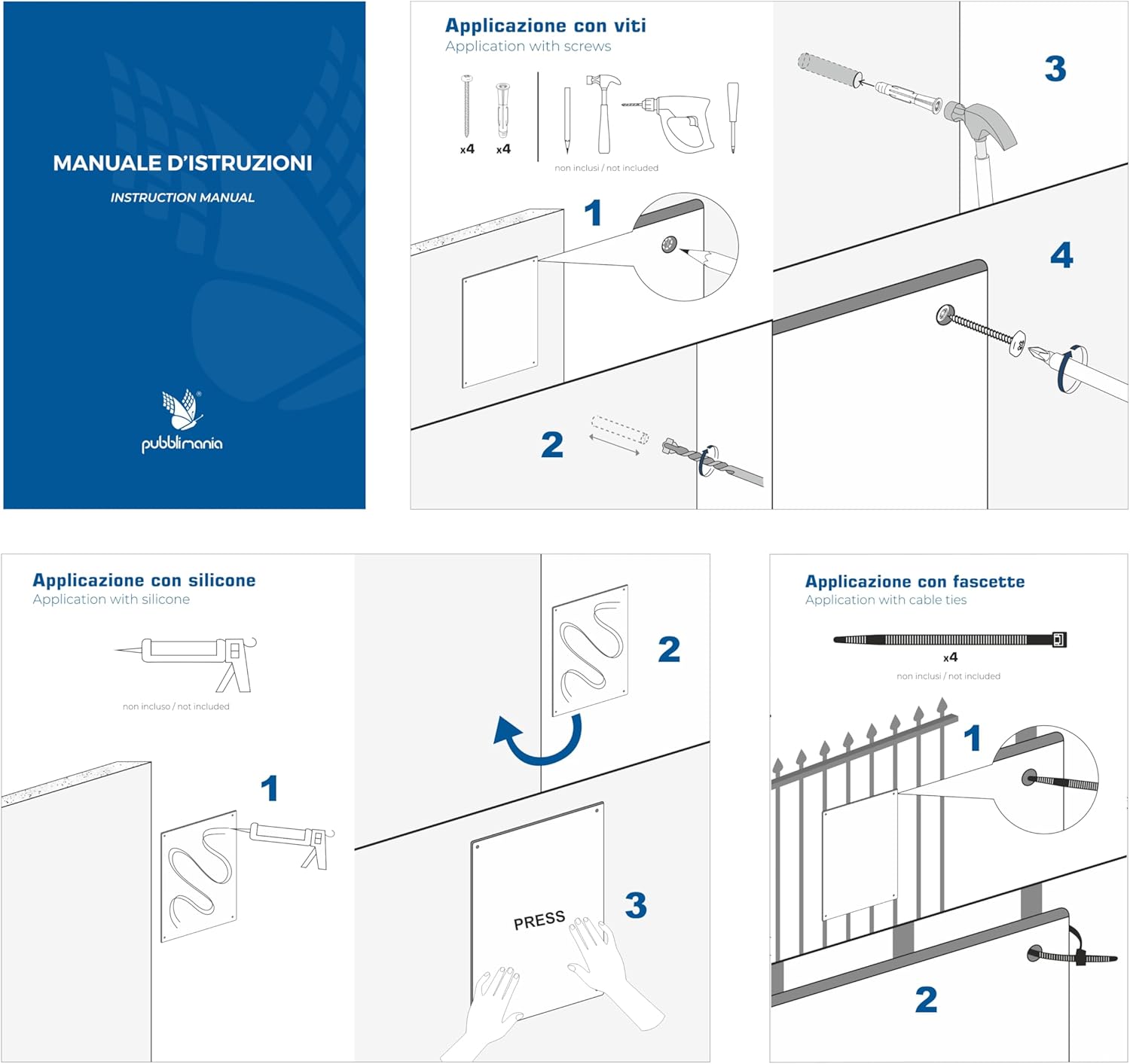 Direkt auf das Trägermaterial mittels UV-Technologie gedruckt – Hergestellt aus Aluminium-Verbundmaterial (zwei Aluminiumschichten mit Polyethylenkern). Äußerst witterungsbeständig, resistent gegen Wasser, Sonne, UV-Strahlung, Staub, Schlamm usw. Das „Vorsicht Hund“-Schild verfügt über vier vorgebohrte Löcher zur Befestigung mit Dübeln, Schrauben oder direkt mit Silikon oder anderen Klebstoffen. Entworfen und gedruckt in Italien von Pubblimania (Synonym für Qualität und Langlebigkeit).