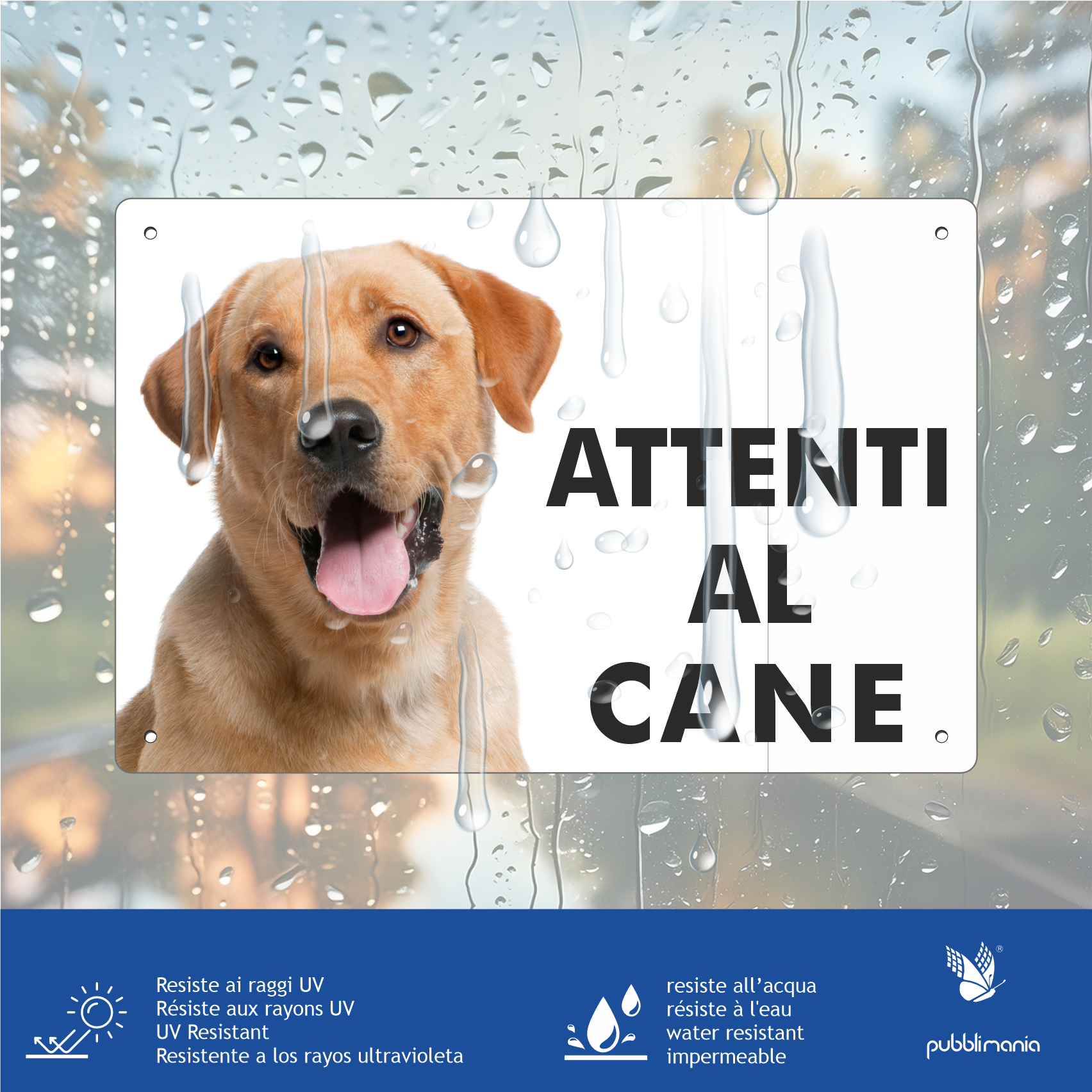 Direkt auf das Trägermaterial mittels UV-Technologie gedruckt – Hergestellt aus Aluminium-Verbundmaterial (zwei Aluminiumschichten mit Polyethylenkern). Äußerst witterungsbeständig, resistent gegen Wasser, Sonne, UV-Strahlung, Staub, Schlamm usw. Das „Vorsicht Hund“-Schild verfügt über vier vorgebohrte Löcher zur Befestigung mit Dübeln, Schrauben oder direkt mit Silikon oder anderen Klebstoffen. Entworfen und gedruckt in Italien von Pubblimania (Synonym für Qualität und Langlebigkeit).