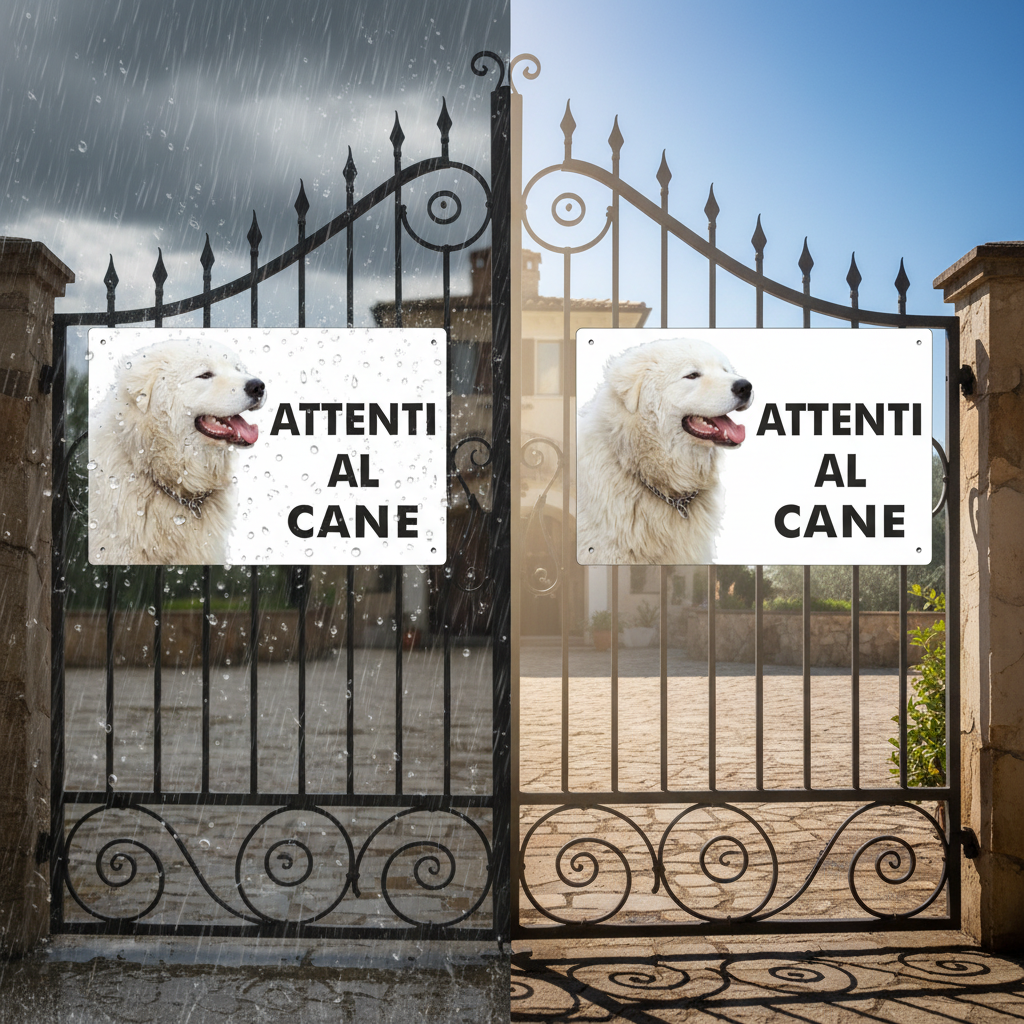 Direkt auf das Trägermaterial mittels UV-Technologie gedruckt – Hergestellt aus Aluminium-Verbundmaterial (zwei Aluminiumschichten mit Polyethylenkern). Äußerst witterungsbeständig, resistent gegen Wasser, Sonne, UV-Strahlung, Staub, Schlamm usw. Das „Vorsicht Hund“-Schild verfügt über vier vorgebohrte Löcher zur Befestigung mit Dübeln, Schrauben oder direkt mit Silikon oder anderen Klebstoffen. Entworfen und gedruckt in Italien von Pubblimania (Synonym für Qualität und Langlebigkeit).